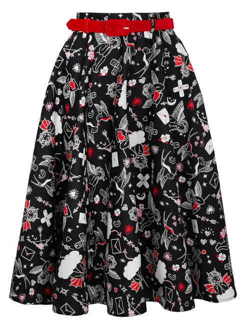 The Charlie Skirt is a classic 50's circle skirt featuring a black base adorned with dreamy cherubs, swallows, hearts, and flowers. With pockets and a striking red belt to accentuate your waist, its full circle design will have you spinning with joy. Good news: nothing can hold you back 🖤