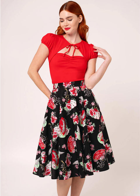 Hell Bunny présente une jupe swing inspirée des années 50, à jupe cercle et belle ampleur.