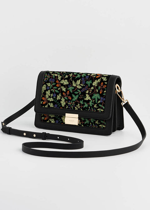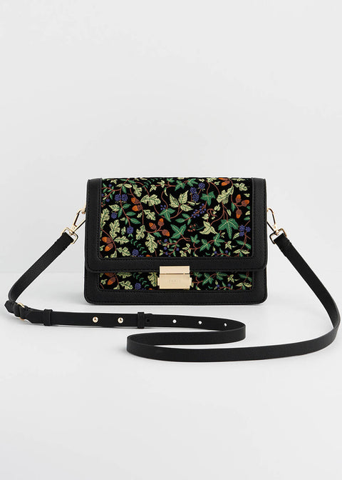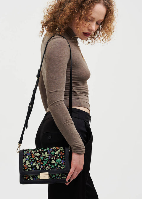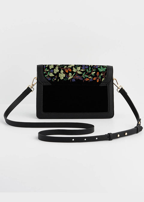 De blaadjes en eikeltjes zijn gevallen deze herfst - en zijn geborduurd op Cathy! Dit zwarte retro-tasje is met haar 23,5 cm breed ruim genoeg voor je belangrijkste spulletjes als een telefoon en portmonnee. Zo'n rustgevend bosritueel wil je toch overal mee naartoe nemen?