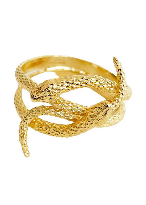 À la fois élégante et somptueuse, riche en détails tout en restant légère : cette bague plaquée or 14K au motif de serpents est une création artisanale fabriquée à la main à Paris et sublime tant les looks sobres que les styles éclectiques.